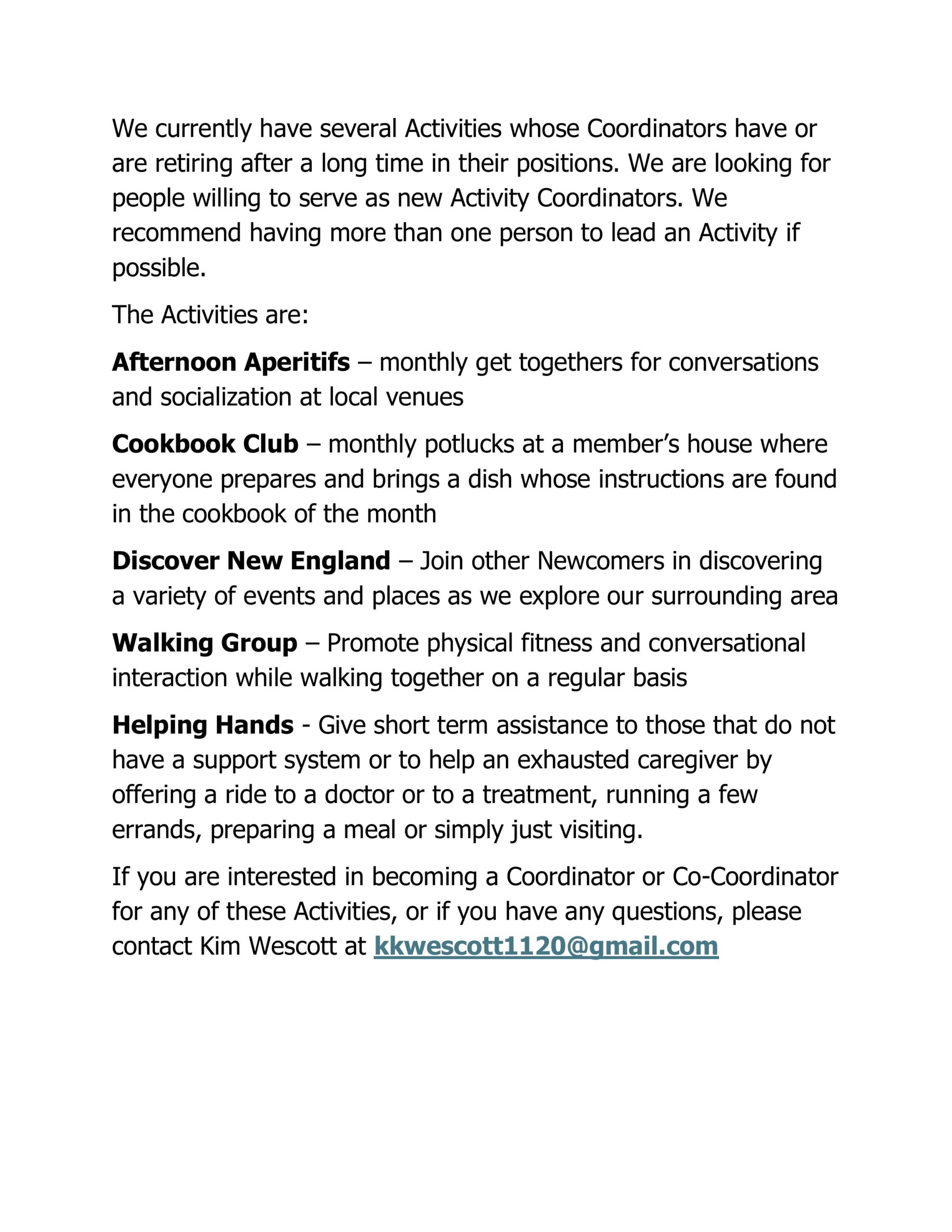 Simsbury Newcomers & Neighbors is a non-profit organization located in Simsbury, Connecticut. Our mission centers on community. We bring newcomers and neighbors together to meet, to develop friendships and to socialize.